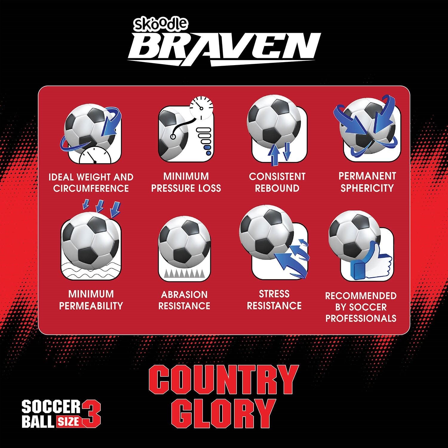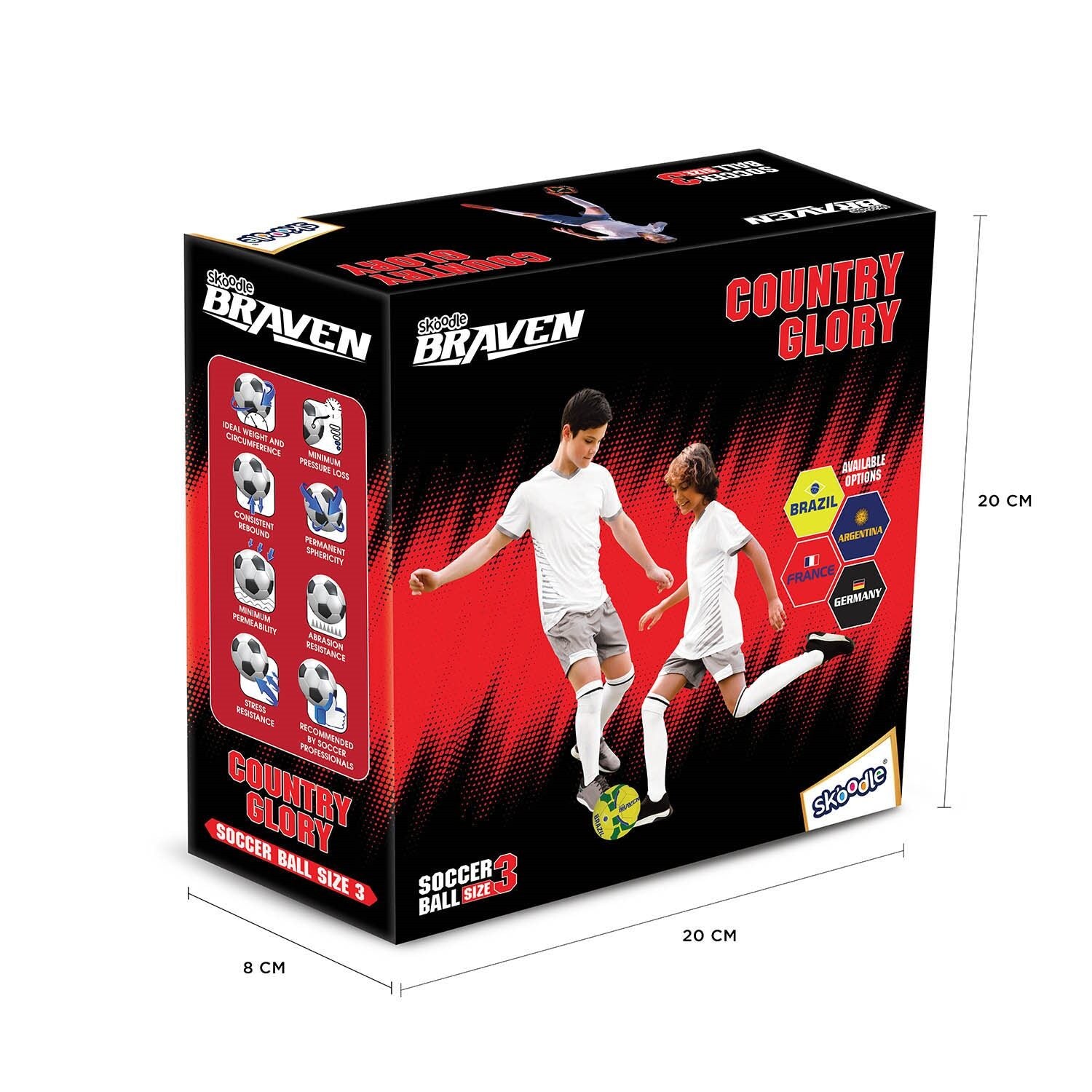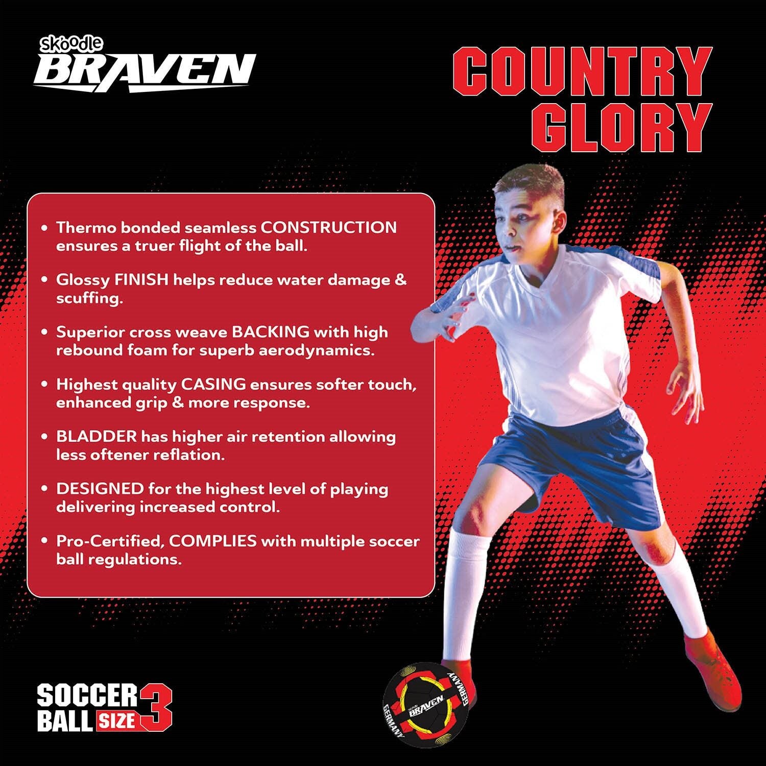 Premium Size-3 Training Football – The BRAVEN Country Glory Football is designed for young footballers and beginners, offering the perfect size and weight for skill development and fun play.
