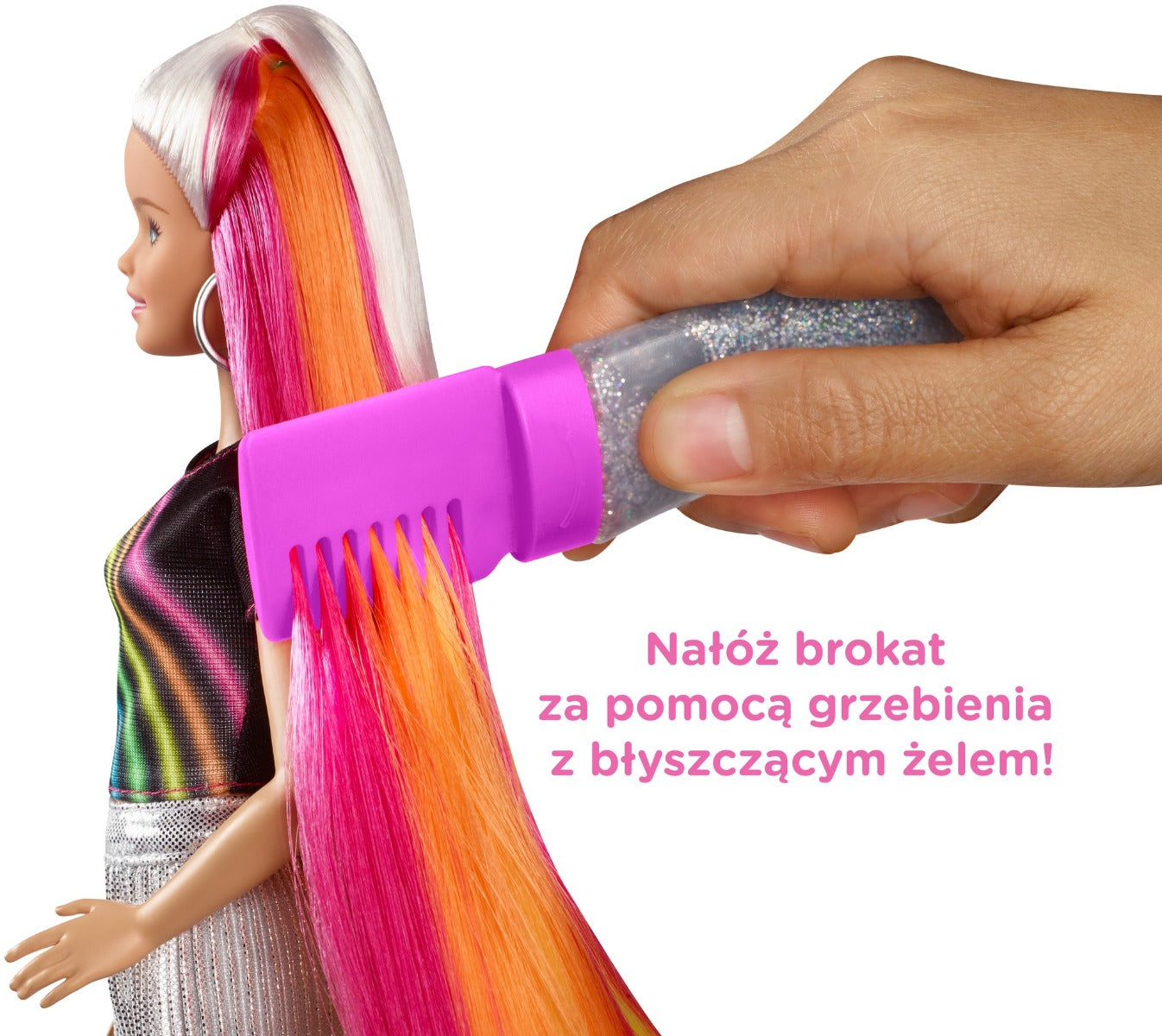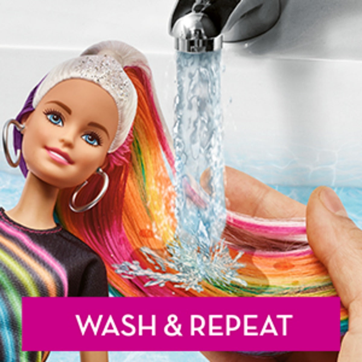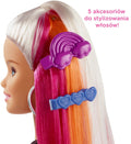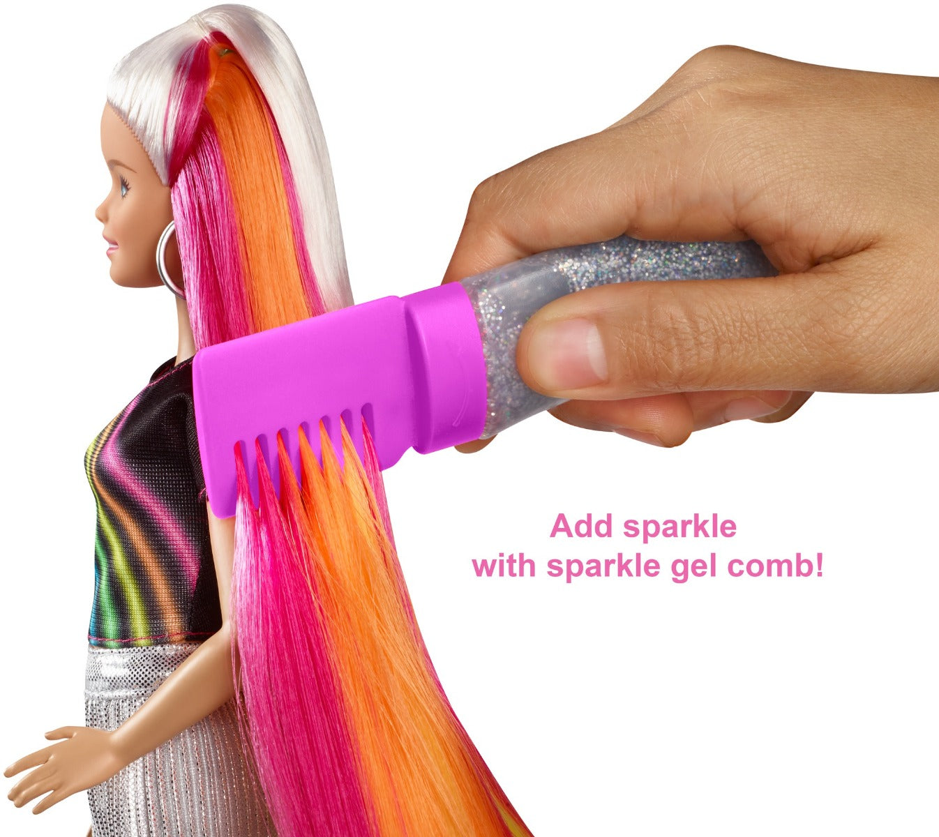 Barbie® Rainbow Sparkle Hair doll inspires imaginations to create so many hairstyles and the stories to go along with them! Barbie® doll hides a rainbow of color in her extra-long hair -- 7.5 inches -- that can be styled for a wow moment. Plus, she comes with a sparkle gel tube with comb and accessories for even more unique looks. Attach the gel to the comb and run through Barbie® doll's hair while squeezing to add shimmer to her colorful locks. Then use the clips and hairbands to style with ponytails, pigtails, braids, updos and so much more! Then take it down, wash out the sparkle with water and start anew. The doll makes a great gift for young stylists 5 to 7 years old who will love expressing themselves with dazzling looks over and over again. Barbie® doll wears an outfit to match her hair with a rainbow graphic on her shirt and a silvery metallic skirt. Each new look can spark a different story and a new idea because when a girl plays with Barbie®, she imagines everything she can become! Includes Barbie® Rainbow Sparkle Hair doll wearing fashion and accessories with extra-long hair, sparkle gel tube and comb and hair accessories. Doll cannot stand alone. Colors and decorations may vary.