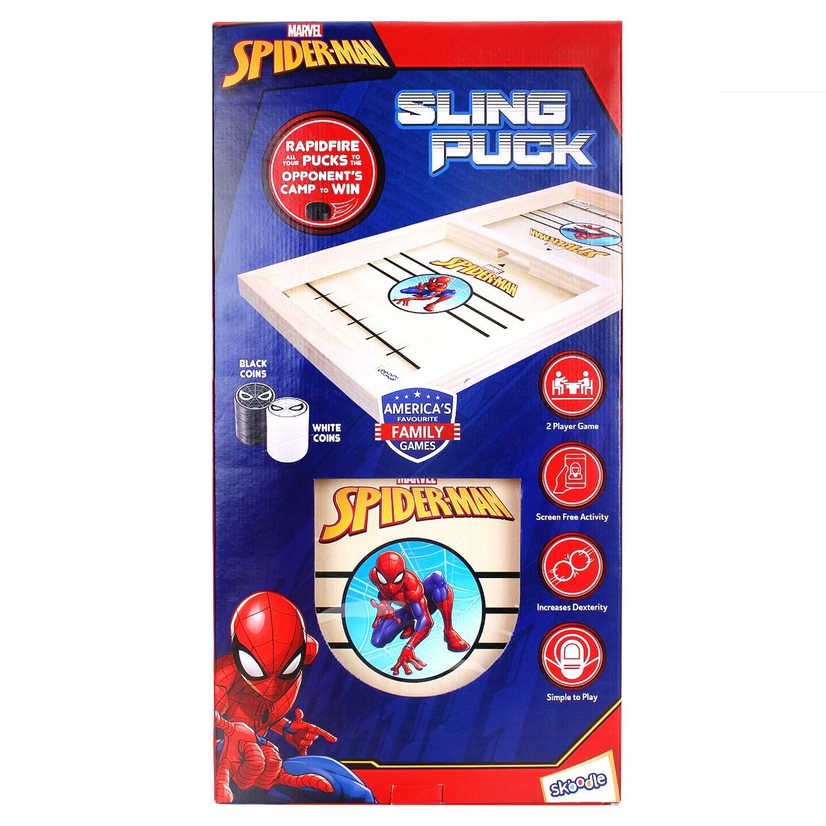 SKOODLE Spider Man Sling Puck Board games help children learn important social skills such as waiting, turn taking, sharing, how to cope with losing, making conversation, problem solving, compromising, collaborating and being flexible. This Sling Puck Board Game is great for reducing stress and makes for laughter with family and friends. Great family games include components that are very engaging to see, touch, feel, and play with.